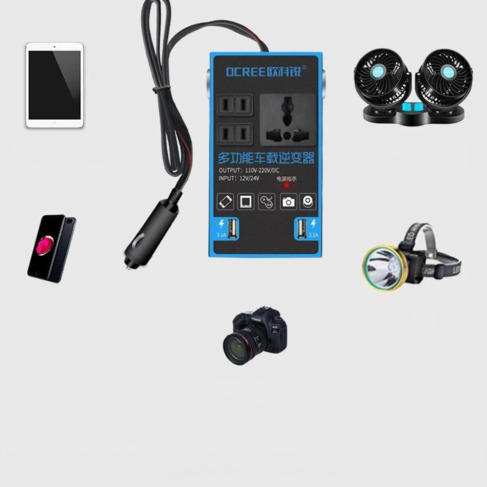 • تعدد المنافذ للاستعمال اليومي:: يمكنك تشغيل اللابتوب، شحن الهواتف، تشغيل الأجهزة الصغيرة… كل هذا من مكانك داخل السيارة..